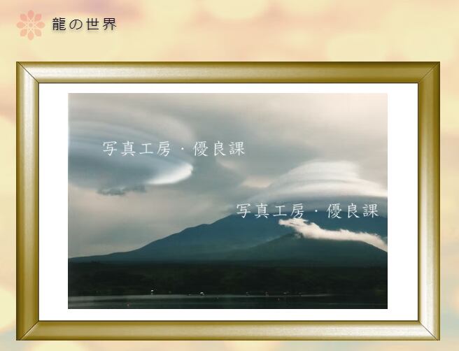 現れた龍雲は、上空の吊るし雲と笠雲を伺うようで、撮影時に起こった大変稀な現象は、龍の世界を捉えたような写真になっています。