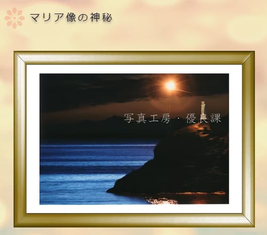 写真は夕暮れ後の神々しい姿を写すために撮影を行った時の一コマで不思議な現象を捉えていました。写真のマリア像を良く見ていただくと本来一体である像が動いているように写っています。マリア像は海を見ている方角に建てられていますので御顔は横顔なのですが前後に動いているように写り込んでいる像の中間にある御顔がこちらを向いているのです。正面の姿は海上でしか拝めないのですが、写真では像の作りの如く少しあごを引いた御顔が確認できます。聖母マリア像は多くの奇跡を起こし、その都度病気の快癒現象などが報告される等マリア像に不思議な事が起こると周りにも奇跡を起こしているようです。