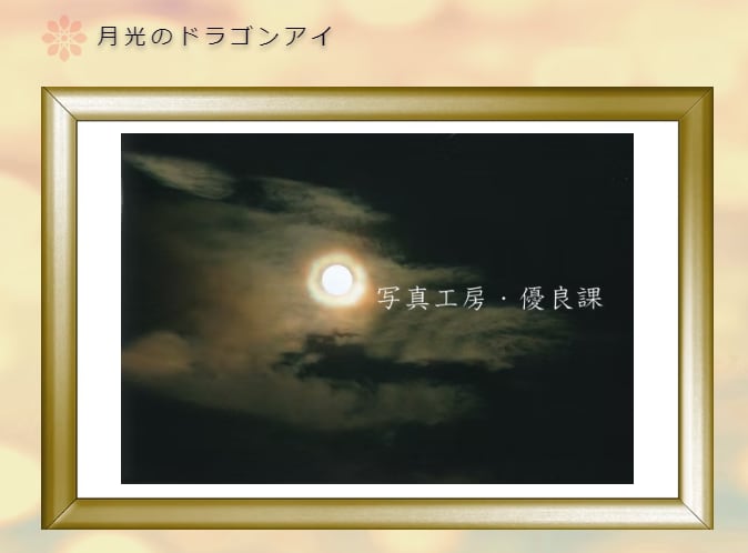 写真の月光環は、月の輪郭から少し距離を取った場所に、にじんだ光輪が現れた大変稀な状態で、スクリーンのようになった雲は満月の位置から龍の顔を作り上げて行きました。