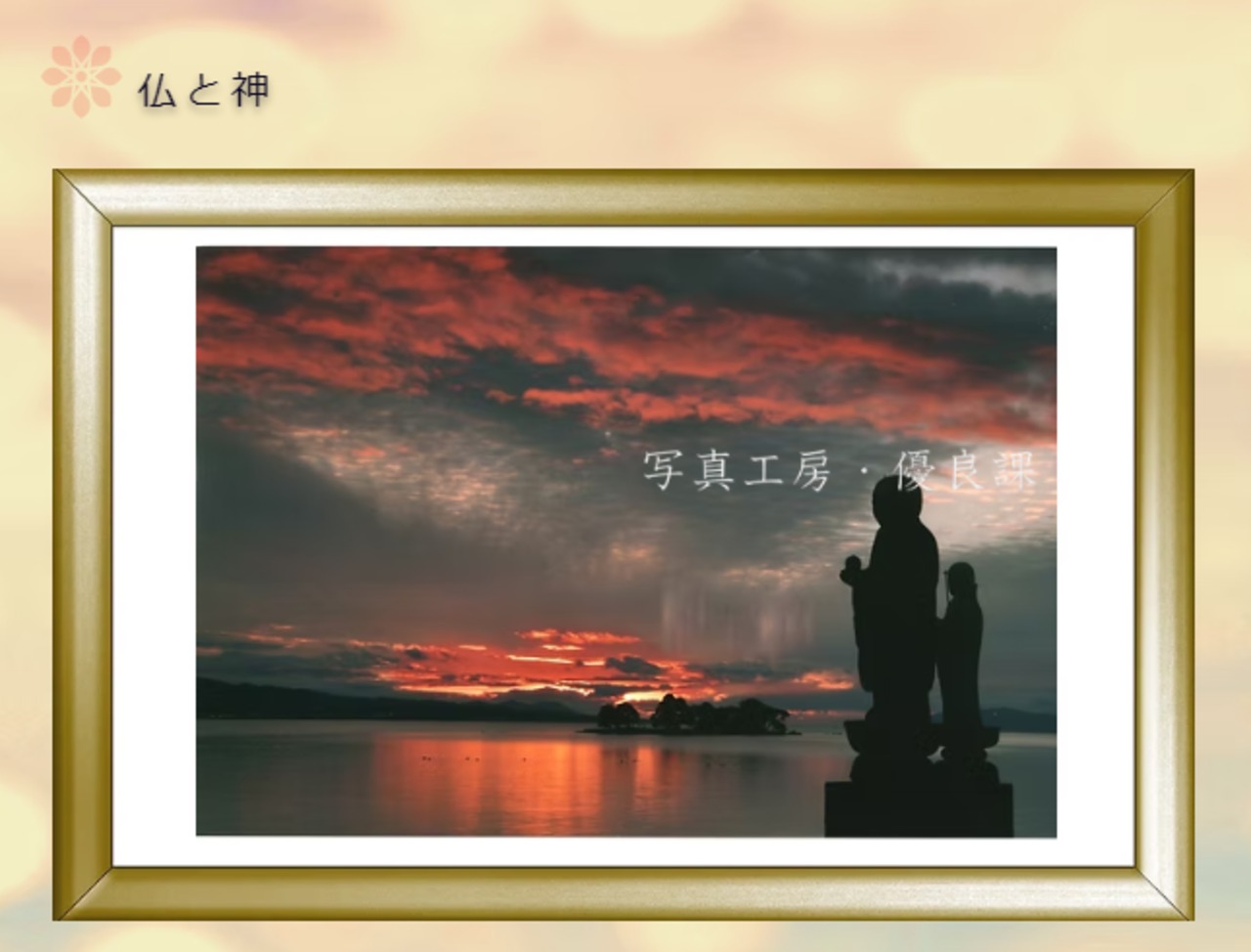 美しく茜色に染まった画面の、手前に仏様、奥に神事が写る、大変尊いカットになりました。仏は「陽」、神は「陰」、いつも我々の生活に共にあると言われます。双方が一つの画面に捉えられた写真は大変に稀です。